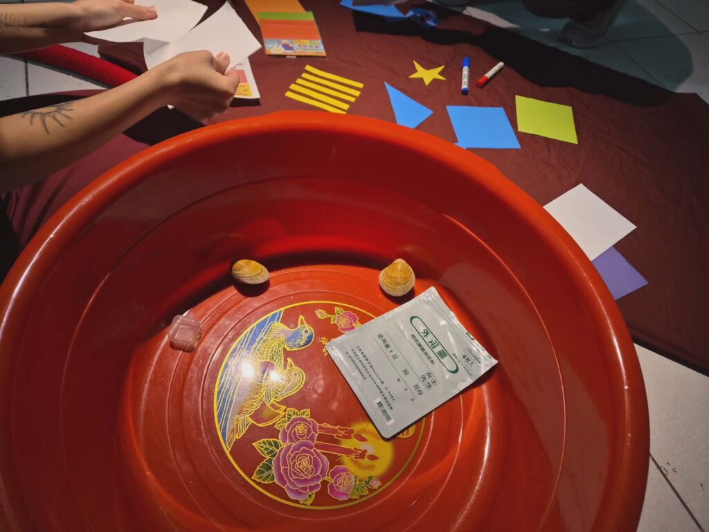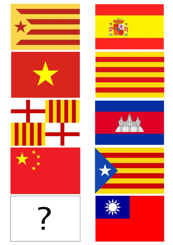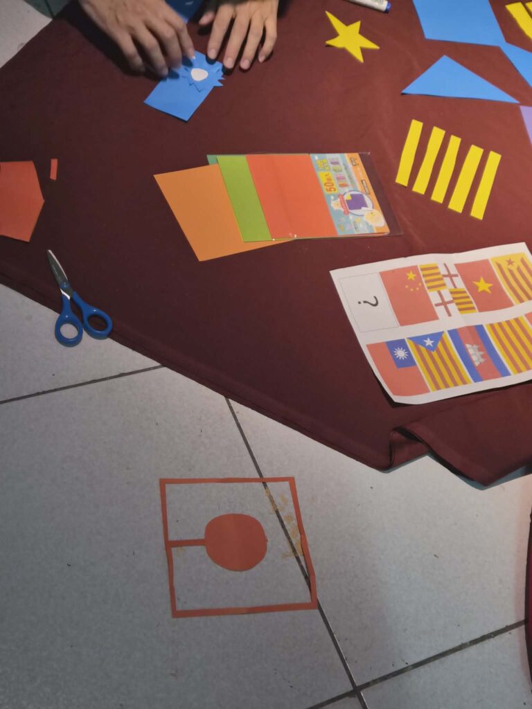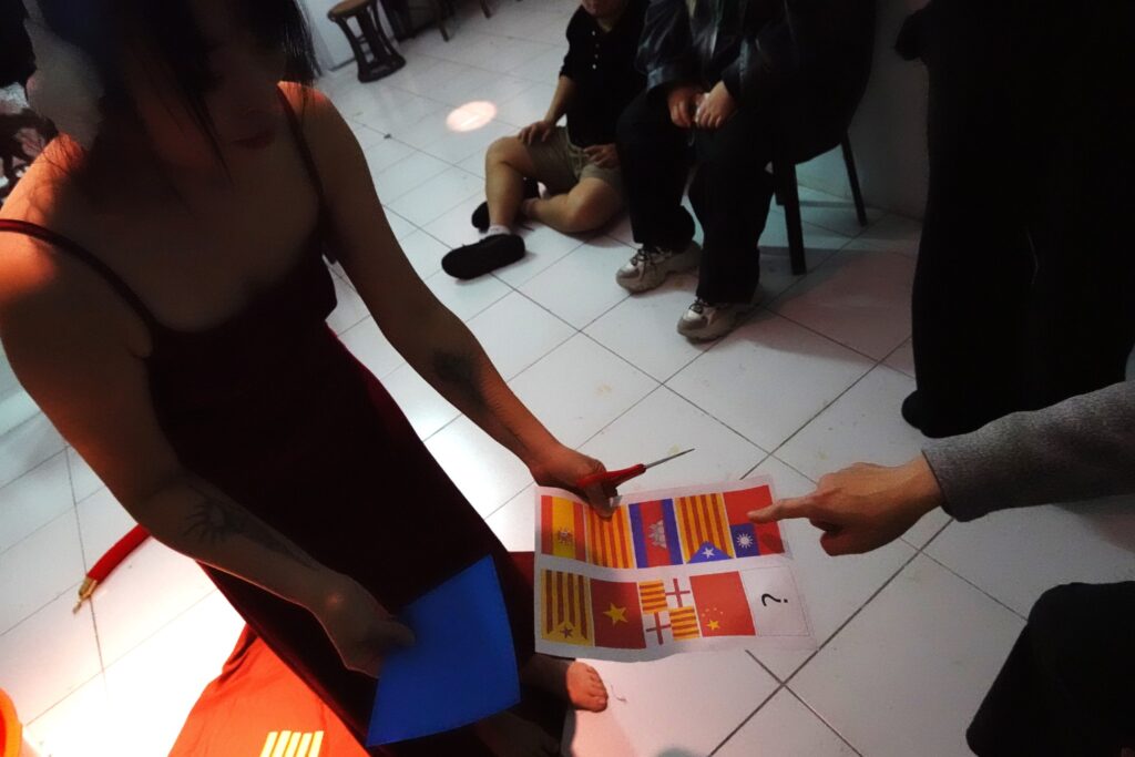 拿出紅布、色紙、與印有加泰隆尼亞、巴塞隆納、西班牙、越南、柬埔寨、台灣、中國,以及?等國旗,隨機和現場人選擇剪排在紅布上