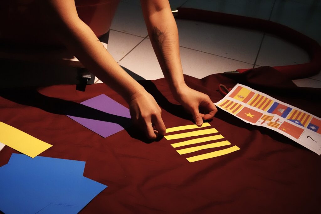 They take out a red cloth, some colored paper, and printed flags of Catalonia, Barcelona, Spain, Vietnam, Cambodia, Taiwan, China, and unknown countries, then make the chosen flags with the audience onto the red cloth.