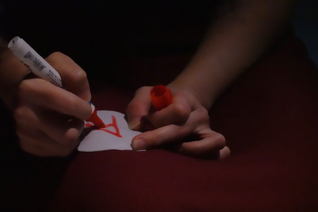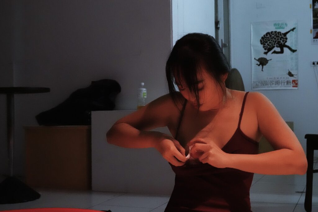 They tear a strip of red cloth to make a belt, cut adhesive pain-relief patches and write “AA”, and paste them on the breasts.